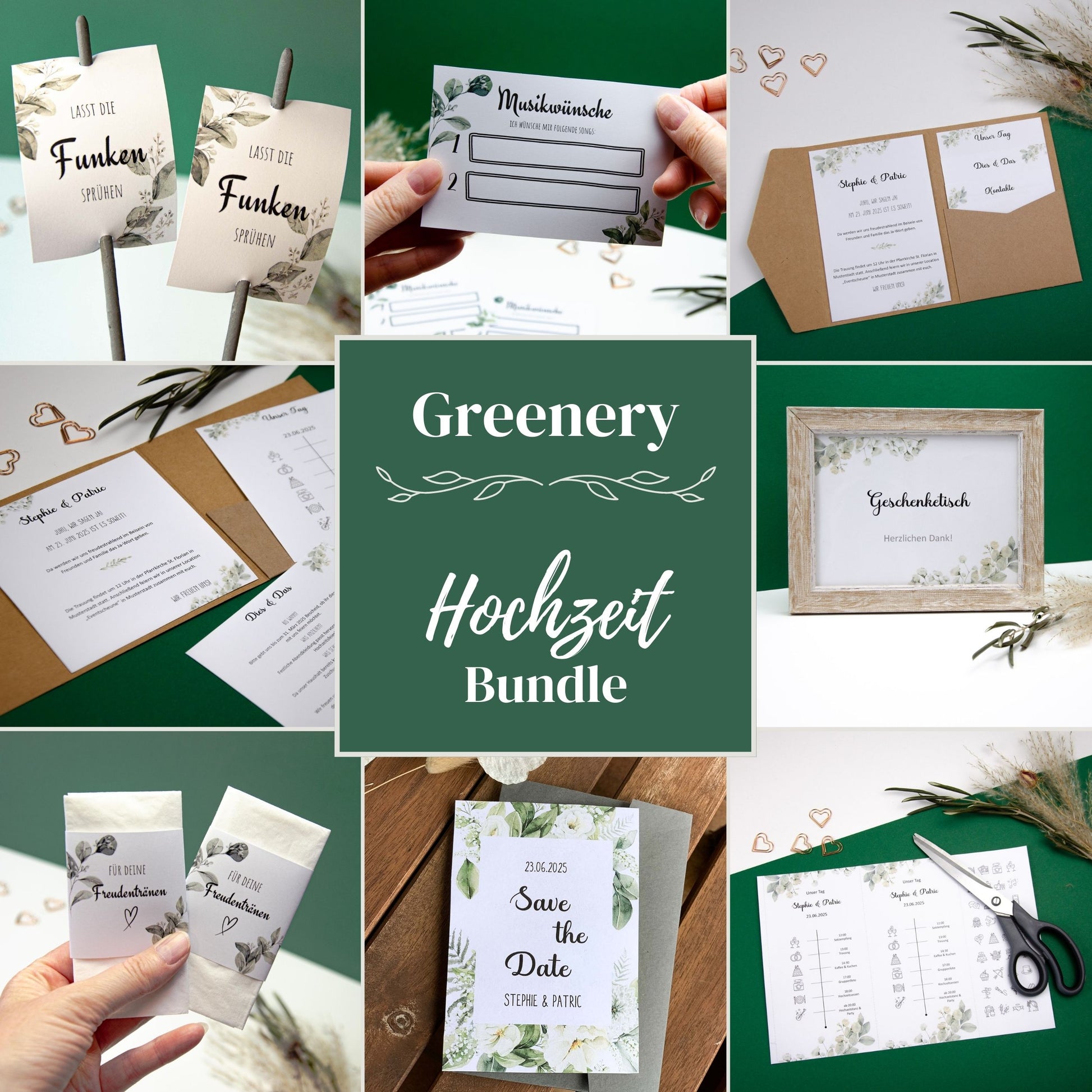 Verleiht eurem großen Tag einen einheitlichen Look! Mit unserem liebevoll gestalteten Hochzeits-Bundle im Greenery-Design könnt ihr eure Hochzeit bis ins Detail stilvoll und persönlich gestalten. Diese hochwertigen personalisierbaren Druckvorlagen bieten euch alles, was ihr braucht – der zauberhafte Start in eure gemeinsame Zukunft!