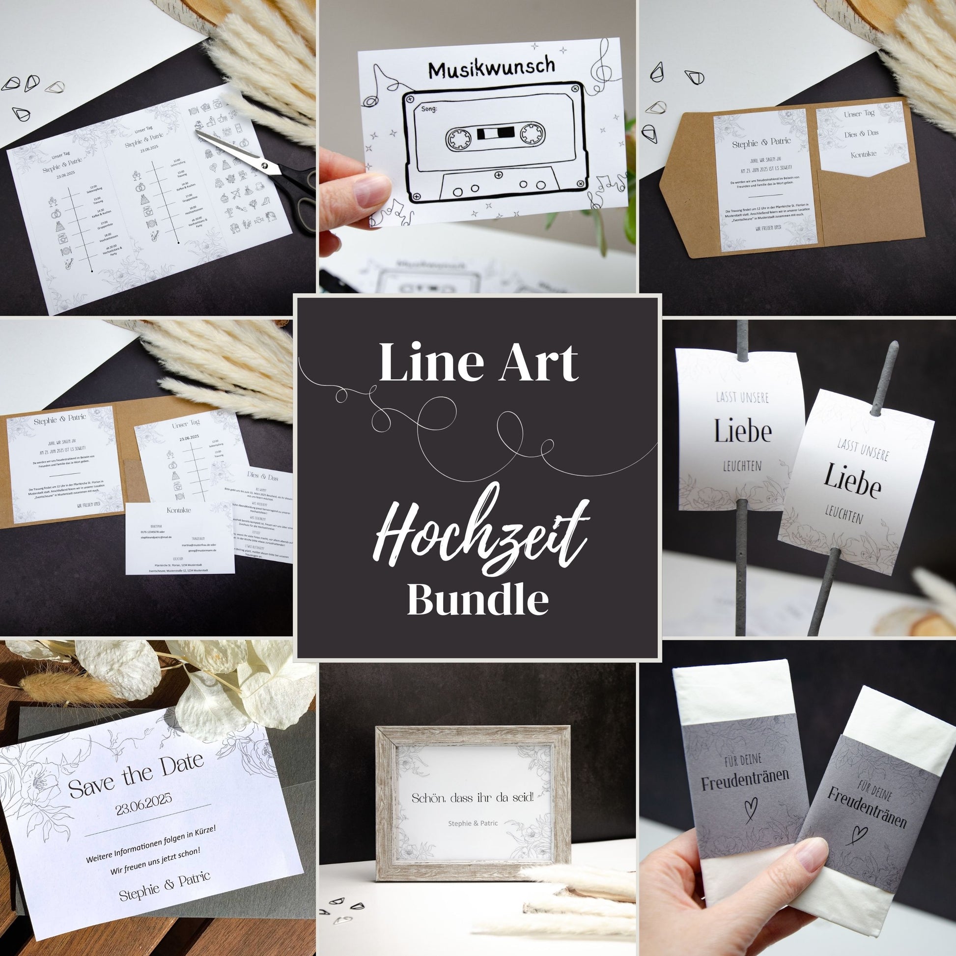 Verleiht eurem großen Tag einen einheitlichen Look! Mit unserem liebevoll gestalteten Hochzeits-Bundle im LineArt-Design könnt ihr eure Hochzeit bis ins Detail stilvoll und persönlich gestalten. Diese hochwertigen personalisierbaren Druckvorlagen bieten euch alles, was ihr braucht – der zauberhafte Start in eure gemeinsame Zukunft!
