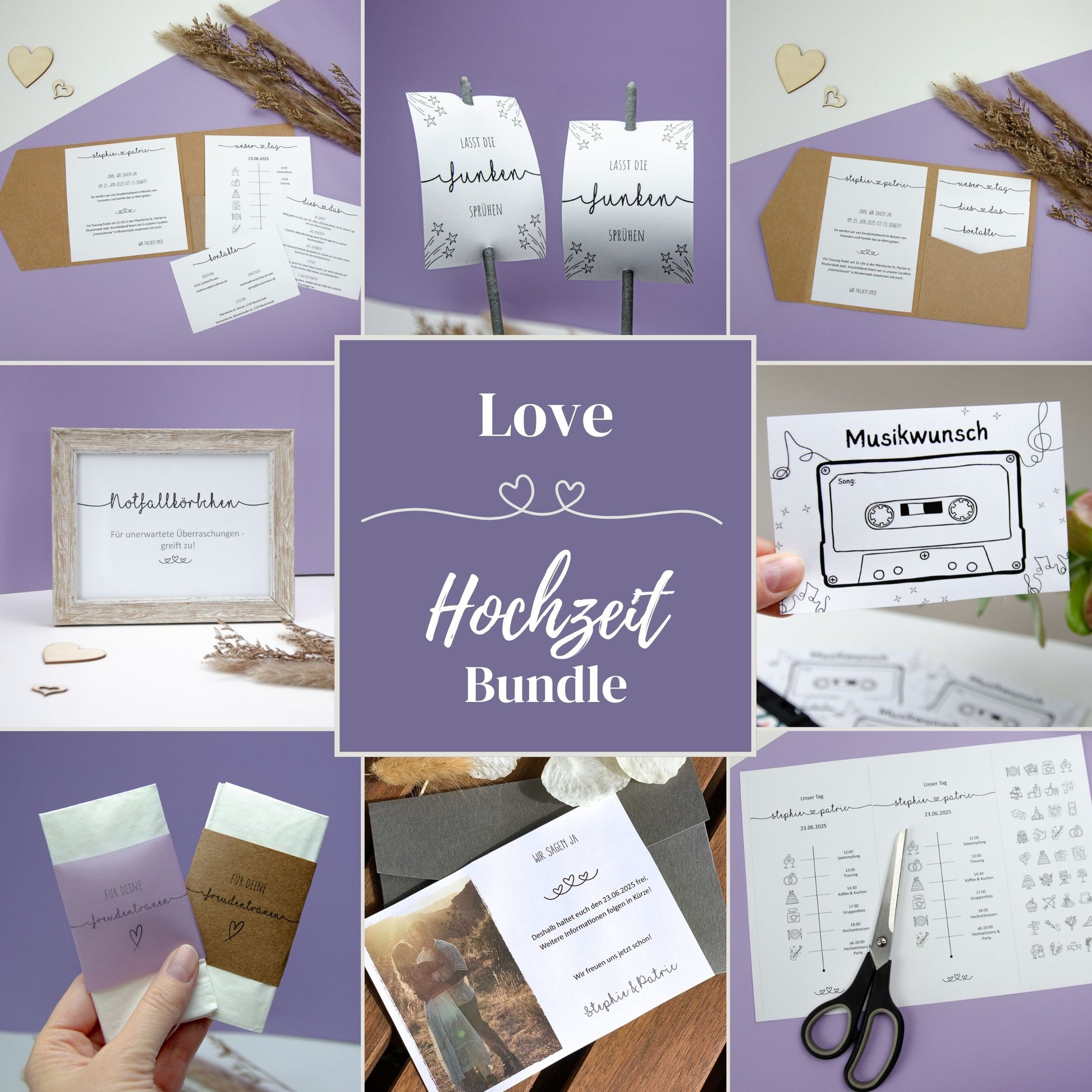 Verleiht eurem großen Tag einen einheitlichen Look! Mit unserem liebevoll gestalteten Hochzeits-Bundle im Love-Design könnt ihr eure Hochzeit bis ins Detail stilvoll und persönlich gestalten. Diese hochwertigen personalisierbaren Druckvorlagen bieten euch alles, was ihr braucht – der zauberhafte Start in eure gemeinsame Zukunft!